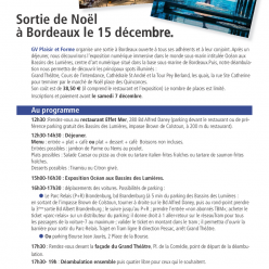 A vos agendas ! Lundi 15 décembre 2025, sortie de Noël à Bordeaux. Programme : 12h30 déjeuner au restaurant, 15h exposition...