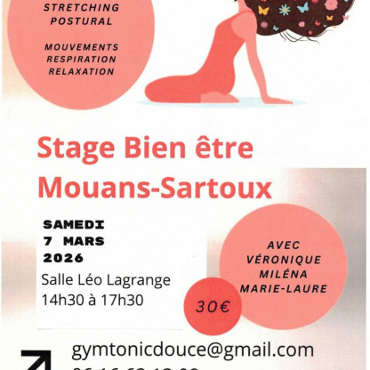 Nos 3 professeurs, Véronique ALLEMAND, Marie-Laure GUALDA et Milena PEZZINI vous propose un Stage "Bien être" le SAMEDI 7 MARS 2026 de 14h30 à 17h30 dans la grande salle de La Laiterie - allée du Parc à Mouans-Sartoux Le thème sera "les tensions nuq...
