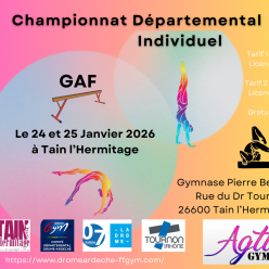 Compétition départementale GAF Individuels 24-25 Janvier 2026 à Tain TARIFS ● Tarif -12 ans : gratuit ● Tarif complet : 3€ ● Tarif licencié : 2€ ● Tarif 2 jours : 5€ ● Tarif licencié 2 jours : 3€ Documents techniques: - Planning prévisionnel:...