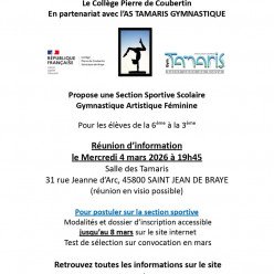Depuis 4 ans, le club des Tamaris s'est associé avec le collège Pierre de Coubertin à Saint Jean de Braye pour développer une Section Sportive Scolaire (Gymnastique Artistique Féminine). Tout en suivant son cursus scolaire, votre fille peut profite...
