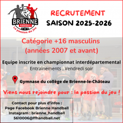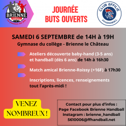 Publié le 10 septembre 2025Le Brienne Handball organise une journée "buts ouverts" (portes ouvertes) ce samedi 6 septembre au gymnase du collège de Brienne....
