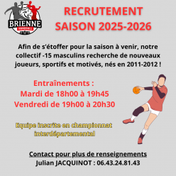 Publié le 13 septembre 2025RECRUTEMENT FILIÈRE MASCULINE Notre collectif -15 masculins recrute toujours de nouveaux joueurs afin de compléter son effe...