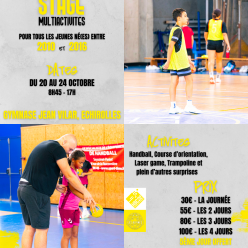 Bonjour à tous, Nous proposons, pour vos enfants, un stage de perfectionnement au handball du 20 au 24 Octobre (1ere semaine des vacances de la Toussaint) Ce stage se déroulera de 09h à 17h et aura pour objectif de travailler sur différents thèmes...