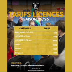 Baby hand : 65 € 6/11 ans : 80 € 12/16 ans : 100 € Seniors : 125 € Loisir : 100 € Tarif famille, réduction fratrie...