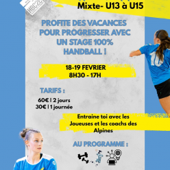 Profite des vacances pour progresser avec un stage 100% HANDBALL ! Encadré par les coachs des Alpines, ce stage perf' te permettra d'améliorer ton jeu, de t'entrainer sérieusement et de passer deux jours entre passionés !