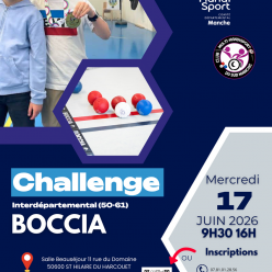 Handisport • (50) • Comité Départemental Handisport de la Manche Challenge de Boccia – Saint-Hilaire-du-Harcouët Nous vous donnons rendez-vous le mercredi 17 juin 2026 pour un challenge interdépartemental de boccia (50-61). 📍 Salle Beauséjour... Publié le 10 avril 2026