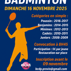 Bonjour à toutes et à tous, Le BADCO a le plaisir de vous inviter à son tournoi annuel qui se tiendra le samedi 16 novembre 2025 à Comines (Belgique). Nous serions ravis d’accueillir vos joueurs et joueuses pour partager une journée sportive...