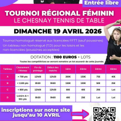 À vos agendas ! Le Club du Chesnay Tennis de Table organise le dimanche 19 Avril 2026 son premier Tournoi Régional homologué de...