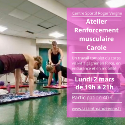 Pour conserver votre entrainement sportif pendant les vacances scolaires, Carole vous propose un atelier de renforcement musculaire de 2 heures alternant un travail de toutes les parties du corps avec ou sans accessoire et des exercices de stretchi...