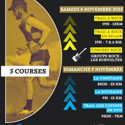 Le samedi : Le Trail&Rock en solo ou en relais. Bien plus qu'un trail, une course de 7km suivi d'une soirée Rock pour ceux qui le souhaitent ! Et toujours les 3 courses le dimanche : La Vingt 'N, un parcours d'environ 20km dans les chemins autou...
