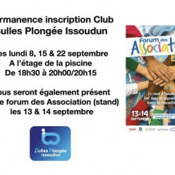 Publié le 05 septembre 2025Permanence inscription Club Bulles Plongée Issoudun les Lundi 8, 15, & 22 septembre A l'étage de la piscine de 18h30 à 20h00/20...