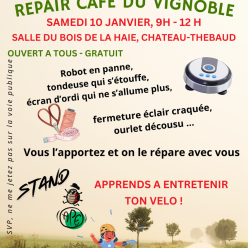 Repair Café du Vignoble Samedi 10 janvier 2026 Samedi 10 janvier 2026, 09h00 - 12h00, salle du Bois de la Haie, Château-Thébaud La mission verte de l'Amicale Laïque de Château-Thébaud, en partenariat avec l'APE Marcel Canonnet de notre école publ...