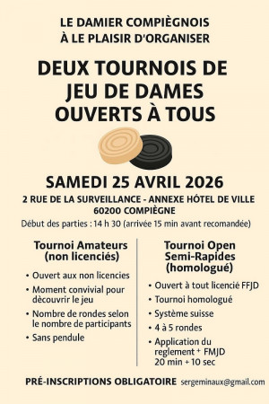 Le Damier Compiégnois organise ce samedi 25 avril à l’Annexe de l’Hôtel de Ville ( 2 Rue de la surveillance à Compiègne) un Tourn...
