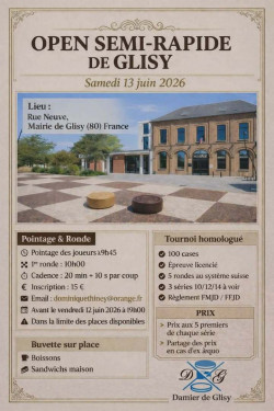 Tournoi amateurs ( non licenciés ) nombre de rondes en fonction des participants , pas de pendule , 1 damier magnétique à gagner . début des parties 14h30 Tournoi open semi rapides ouvert à tout licencié FFJD Homologué Système suisse ( ut...