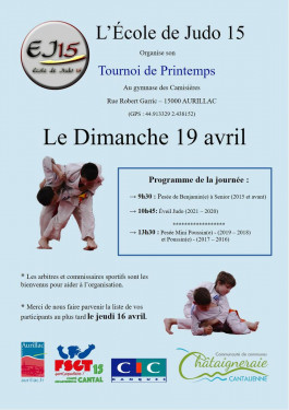 Dimanche 19 avril : au gymnase des Camisières L'Ecole de Judo 15 organisera son "Tournoi de printemps" - 9h30 : pesée des benja...