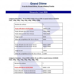 Catégories Masculines : -35 ans (1992 à 2010) +35 ans (1991 et avant) Ceinture JO/VB/M Poids : -60kg ,-66kg ,-73kg, -81kg, -90kg, -100kg, +100kg Nombre de surfaces 7 Pesée officielle le 02/05/2026 : 18h00 à 19h Pesée aléatoire CM -35 et +35 ans :...