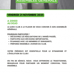 Bonjour à toutes et à tous, Nous avons le plaisir de vous inviter à notre assemblée générale qui se tiendra le vendredi 21 novembre 2025 à 20h00 au dojo. Comme le veux notre tradition, celle-ci sera suivi d'un pot de l'amitié avec dégustation...