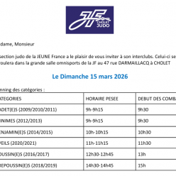 Horaires des pesées : Minimes (2012-2013) 9h00 – 9h15 Benjamin(e)s (2014-2015) 9h00 – 9h15 Eveil judo (2020-2021) 10h30 – 11h00 Poussins (2016-2017) 11h30 – 12h00 Poussinet(te)s (2018) 13h00 – 13h30 Poussinet(e)s (2019) 14h00 – 14h30