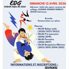 Bonjour l’Entente des dojos du Gard vous invite à son tournois le dimanche 12 avril 2026 à Calvisson, au gymnase de Calvisson à côté du collège Pour les Minimes, benjamins, poussins, pré-poussins, et baby judo Horaires: - 13h30: Benjamins et min...