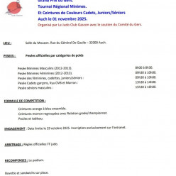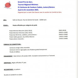 Grand prix ouvert à tous les minimes 2012 et 2013Pesée masculine de 8h à 8h30 Pesée féminine 9h30 à 10h Le club prendra en charge le prix des inscriptions.