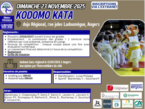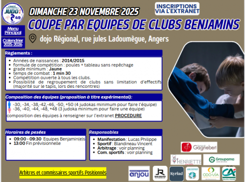 Les 22 et 23 novembre 2025 Samedi 22 novembre : Poussinets/Poussinettes (2018/2019) : • -22 kg → 09h30 • +22 à 25 kg → 12h30 • +25 kg → 14h45 Dimanche 23 novembre : Minimes (2012/2013) → 08h30 Benjamins/Benjamines (2014/2015)...
