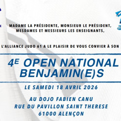 OPEN NATIONAL BENJAMIN(E)S SAMEDI 18 AVRIL 2026 LIEU DOJO FABIEN CANU - RUE DU PAVILLON SAINTE-THERESE, 61000 ALENÇON HORAIRES (UNE PESÉE OFFICIELLE EST ORGANISÉE LE VENDREDI 17 AVRIL de 18H00-20H00) MASCULINS : PESÉE (1KG DE TOLÉRANCE) : 8H3...