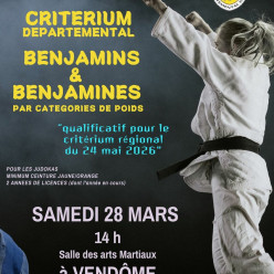 COMPETITION / INDIVIDUELLE / BENJAMIN - Années de naissance : 2014 ->2015 - Couleurs de ceintures : Jaune/Orange -> Marron Le 28/03/2026 - Saison 2025/2026 SALLE DES ARTS MARTIAUX RUE GEOFFROY MARTEL 41100, VENDOME Pesées Benjamins et Benjamines :...