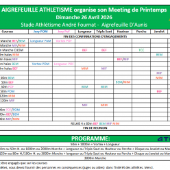 Dimanche 26 avril 2026 Journée des jeunes à Aigrefeuille Poussins, Benjamins et Minimes Rdv à 11h30 pour les Poussins et pour les autres 1h avant votre première épreuves Epreuves pour les poussins = 50m, 1000, Longueur et vortex Merci de répondr...