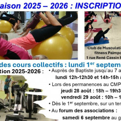 Publié le 26 août 2025Les cours collectifs 2025-2026 débuteront lundi 1er septembre. La salle est ouverte à tous les adhérents munis du badge jusqu'à...