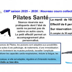 Publié le 03 septembre 2025Avec un effectif limité à 6 personnes, le cours de Pilates santé s'adapte aux situations physiques particulières liées aux suites...