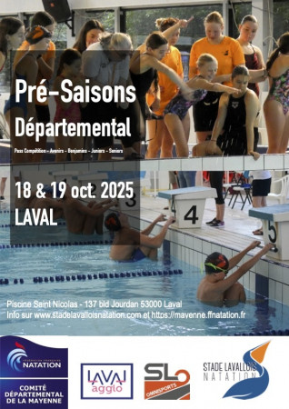 Pré-Saisons à Laval : compétition départementale. Dimanche matin uniquement pour les pass-compétition. Le programme est disponible : https://mayenne.ffnatation.fr/rsc/1616/fichiers/dossiers/315.pdf Attnetion les horaires sont donnés à titre indicat...
