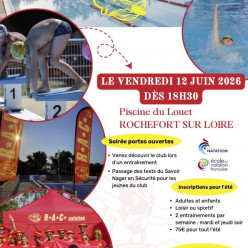 Soirée portes ouvertes Venez découvir le club lors d’un entraînement Passage des tests du Savoir Nager en Sécurité pour les jeunes du club Inscriptions pour l’été Adultes et enfants Loisir ou sportif 2 entrainements par semaine : mardi et jeudi...