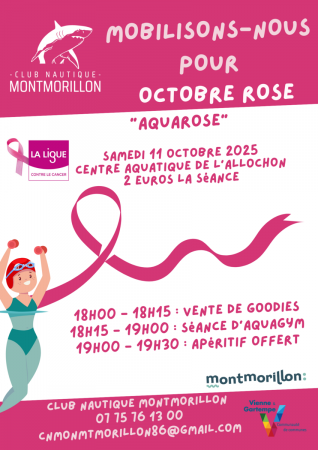Nous organisons une séance d'aquagym le samedi 11 octobre de 18h15 à 19h00 au profit d'Octobre Rose à la piscine de Montmorillon. Ouvert à tous! Séance à 2€ + goodies : tous les fonds seront reversés à la ligue contre le cancer. Nous vous attendon...