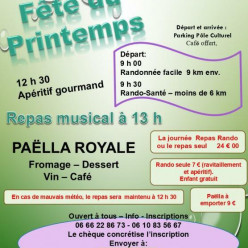 Randonnées : 9h00 9km 9h30 6km 12h30 Apéritif gourmand 13h00 Repas musical : Paella Après-midi récréative