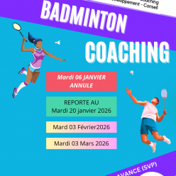 Bonjour les Badistes, Comme prévu, je vous renvoie ce formulaire afin de mettre vos disponibilités sur les 3 jours restants Comme vous le savez , le cours de mardi 6 janvier a dû être annulé à cause des intempéries Celui-ci a été repositionné au m...