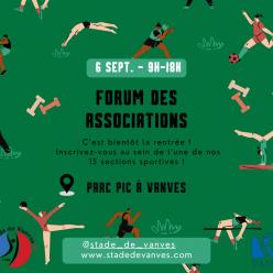 J-13 ! ⏳ Le samedi 6 septembre prochain, de 9h à 18h, le Stade de Vanves sera présent au Forum des associations qui aura lieu au P...