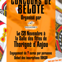 Anjou Baconne organise son concours de belote annuel le vendrdi 28 novembre 25 à la salle de l'étang à Thorigné d'Anjou. Incripti...