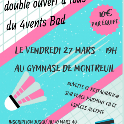 Publié le 20 janvier 2026Deuxième tournoi de badminton en loisirs à MONTREUIL (salle des 4 Vents située ici) le vendredi 27 mars 2026 à 19H00 organisé par...
