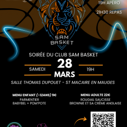 🔥 C’est parti ! Les réservations pour la soirée du club SAM BASKET sont officiellement ouvertes ! 🦁🏀 Rendez-vous le samedi 28 mars à la salle Thomas Dupouet – St Macaire en Mauges pour une soirée à ne pas manquer : ambiance et fun garantis 🎶🔥 🥘 Un...