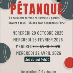 DATE LIMITE DES INSCRIPTIONS LE 4 AVRIL 2026 2 PARTIES DEVRONT ETRE OBLIGATOIREMENT JOUEES et TERMINEES AVANT LA PAUSE DE MIDI. EVENTUELLEMENT QUALIF X3 SF DIMANCHE 1er MARS DANS BOULODROMES