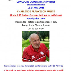 Jet du But : 9h Concours 6 parties 10€ par équipe, limité à 88 équipes. Buvette et restauration type snacking