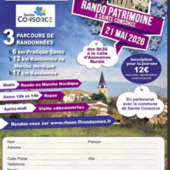 Cet évènement sportif et patrimonial est organisé cette année sur la commune de Saint-Consorce. Trois circuits au choix : 6 km pratique santé, 12 km randonnée ou marche nordique 17 km randonnée Départs 8h30 Repas 12h-14h sur inscription Visi...