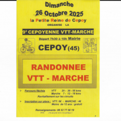 La "Petite Reine de Cepoy”a le plaisir de vous inviter à sa 9ème Cepoyenne VTT marche le dimanche 26 octobre2025. Elle vous propose trois circuits VTT de 25km, 36km ou 55km et trois circuits marche de 7km, 12km, 19km. Les départs auront lieu à par...