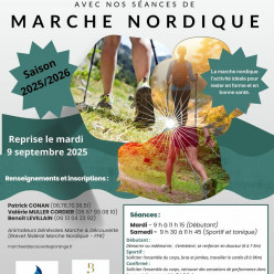 Publié le 26 septembre 2025Séances de Marche Nordique deux fois par semaine Mardi matin à 9 H (durée 2 H15) ouvertes à tous Samedi matin à 9 H 30 ( durée...