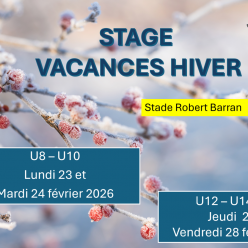 STAGE VACANCES D'HIVER L'Ecole de rugby organise un stage durant la première semaine des vacances d' hiver Le tarif de ce stage est fixé à 10€ par jour, donc 20€ les deux jours par enfant. Le 23 et 24 février pour les catégories U8 et U10 Le 26...