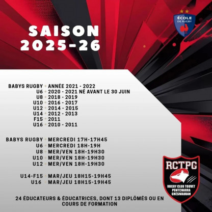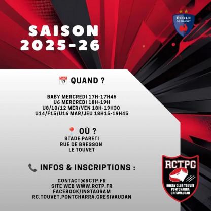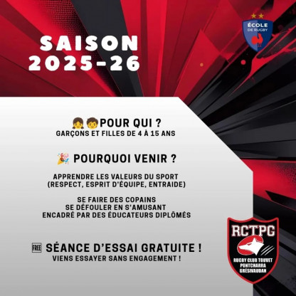Publié le 29 août 2025🏉🔥 C’est la reprise au Rugby Club Touvet Pontcharra Grésivaudan ! 🔥🏉Les entraînements reprennent pour les jeunes de 3 à 11 ans (né...