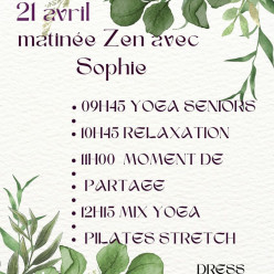 Vous voulez découvrir le yoga et la relaxation, suivi d'un moment convivial, Sophie vous propose une matinée Zen le 21 Avril. Insc...