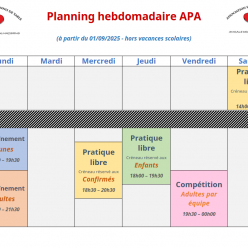 Voici nos horaires hebdomadaires pour la saison 2025-2026 (en période scolaire) : Lundi : 18h00 - 19h30 => entraînement jeunes...