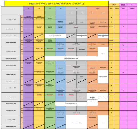 Hello, Pour le mercredi 21 janvier U11 : rendez-vous de 10h-12h à BB en ski classique U13 : foulée blanche (pas d'entra...