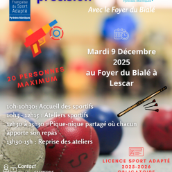 Cette journée est une journée Loisir destinée aux personnes en situation de handicap mental niveau foyers de vie. En partenariat avec le Foyer du Bialé, 3 ateliers sont proposés aux sportifs: Sarbacane Boccia Tir pistolet Laser Cette journée,...
